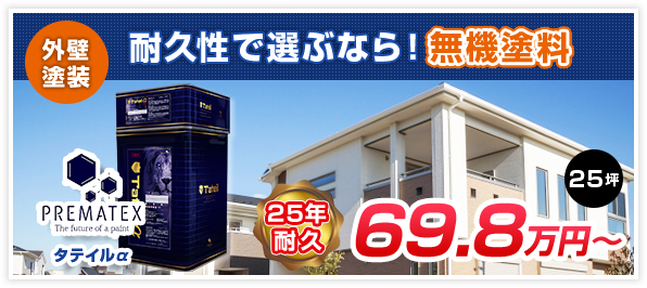 全てコミコミ!養生足場代高圧洗浄下地補修下塗り中塗り上塗り工事保証アフターフォロー プレマテックス タテイルアルファってどんな塗料? 期待耐用年数25年 保証年数15年 高耐久塗料でありながら、ひび割れがしやすいことが無機塗料の従来の欠点でした。 プレマテックス社のタテイルアルファは、無機成分と有機成分のハイブリッド塗料。 超耐候性とひび割れに強いフレキシブル性を兼ね備えた、新世代無機塗料です。 さらに、紫外線による塗膜の劣化を抑制する「ラジカル制御技術」も搭載しています。 汚れに強く、防藻・防カビ性にも優れた、まさに「塗るタイル」と呼ぶべき高性能塗料です。 高性能塗料は、シリコン塗料などと比較して、短期的には割高になります。 しかし、塗り替えまでの期間が長くなるため、長期的にはかえってコストパフォーマンスが高くなります。 長くお住まいになりたい方におすすめの塗料です。 < 色も豊富なお手軽遮熱塗料 日本ペイント サーモアイSiコスパで選ぶならラジカル塗料!アレスダイナミック >